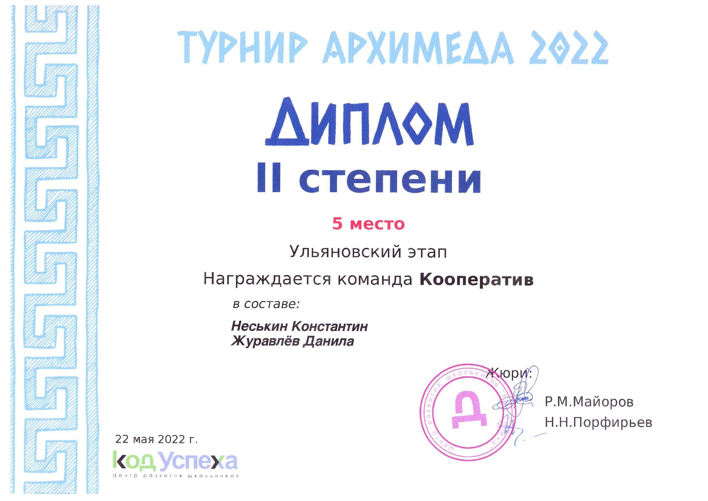 - Журавлев Данила, Командная олимпиада, Неськин Константин, Областной (городской) уровень, Призёр, Программирование