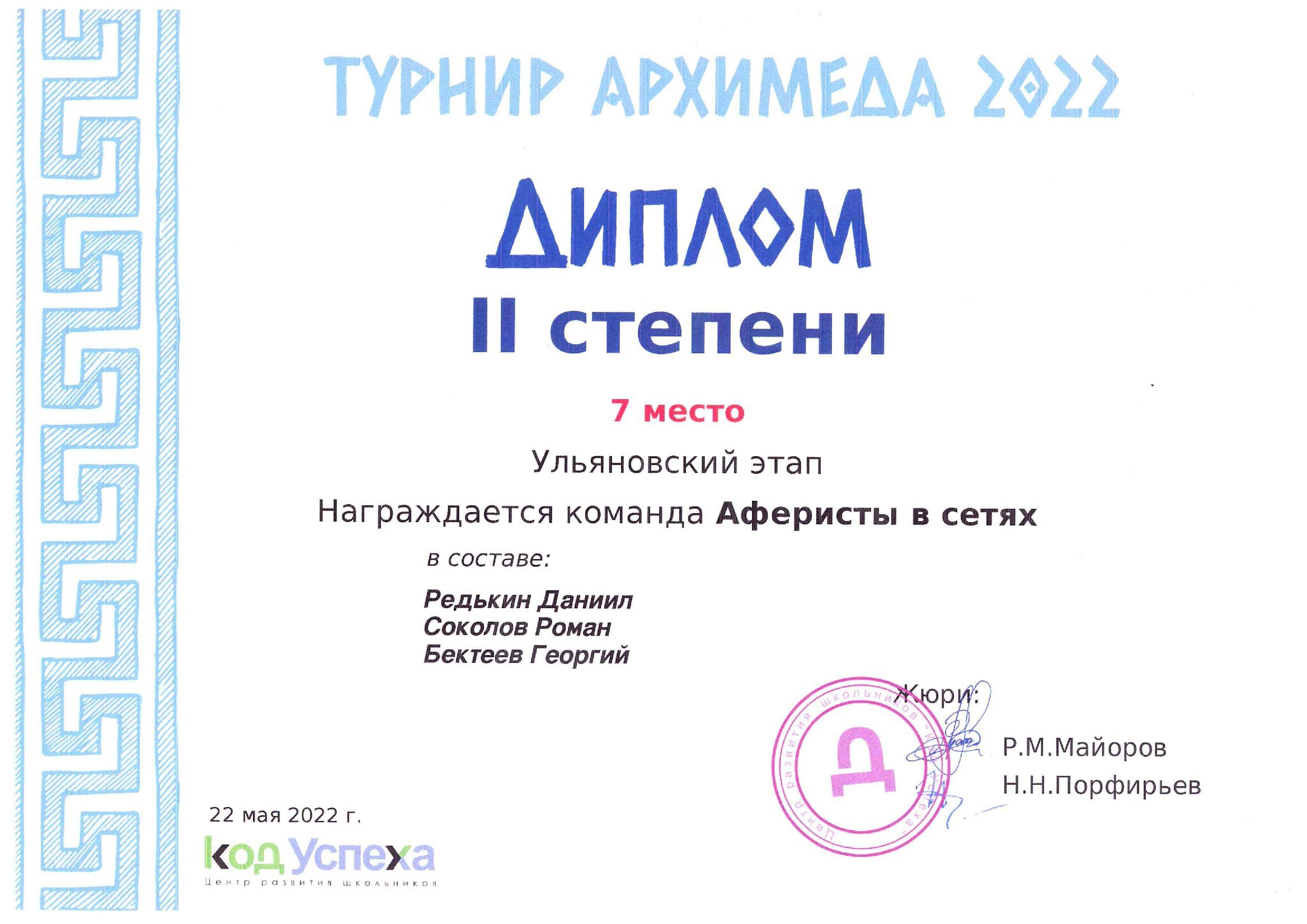 - Бектеев Георгий, Командная олимпиада, Областной (городской) уровень, Призёр, Программирование, Редькин Даниил, Соколов Роман