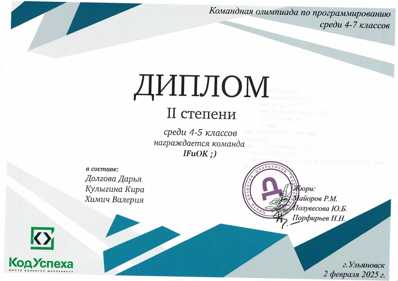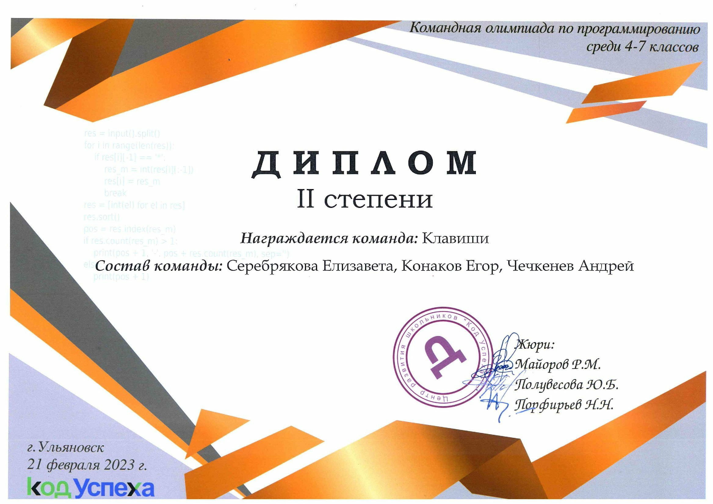 - Код Успеха, Командная олимпиада, Конаков Егор, Призёр, Программирование, Серебрякова Елизавета, Чечкенев Андрей