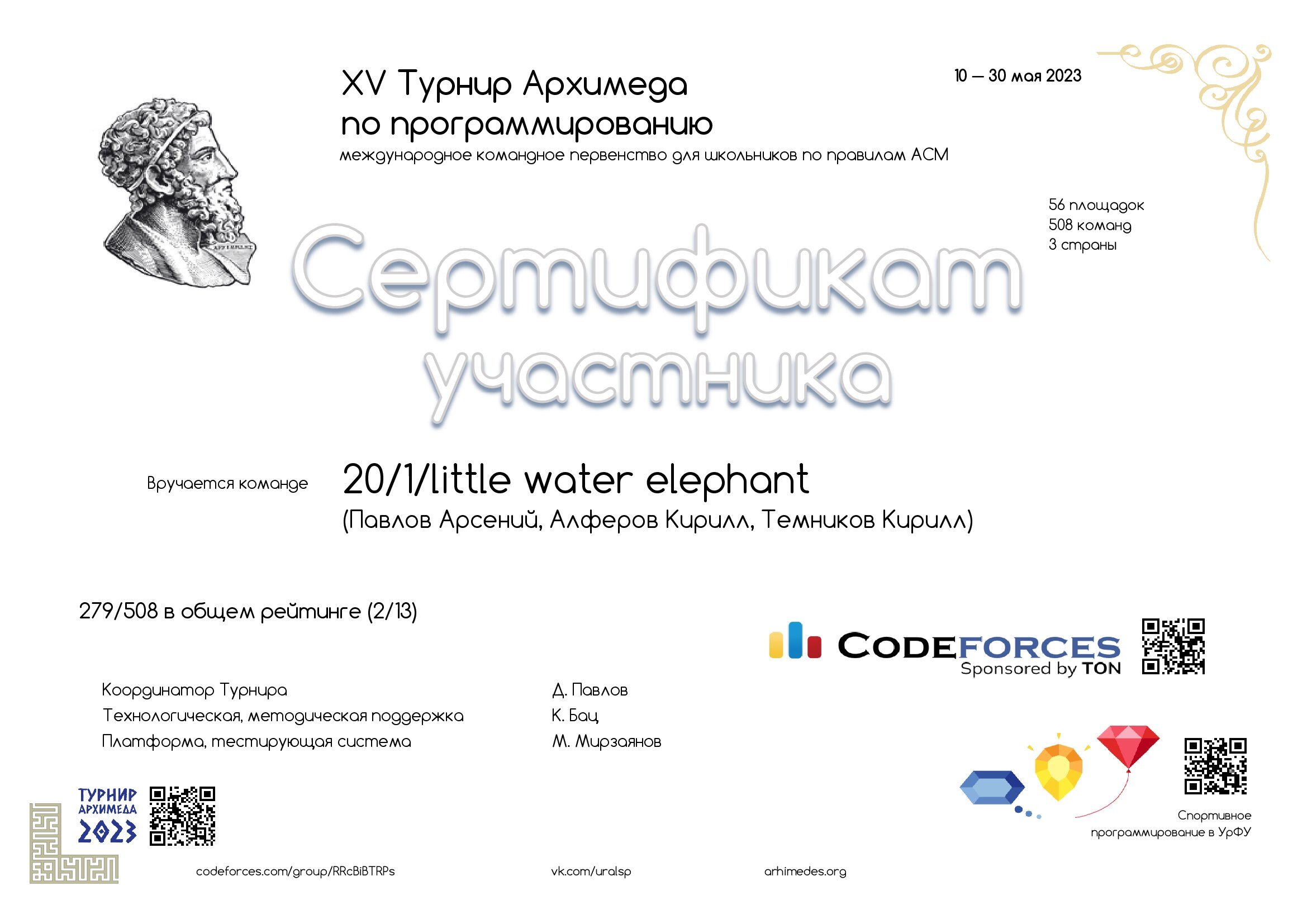- Алферов Кирилл, Всероссийский уровень, Командная олимпиада, Павлов Арсений, Программирование, Темников Кирилл, Участник