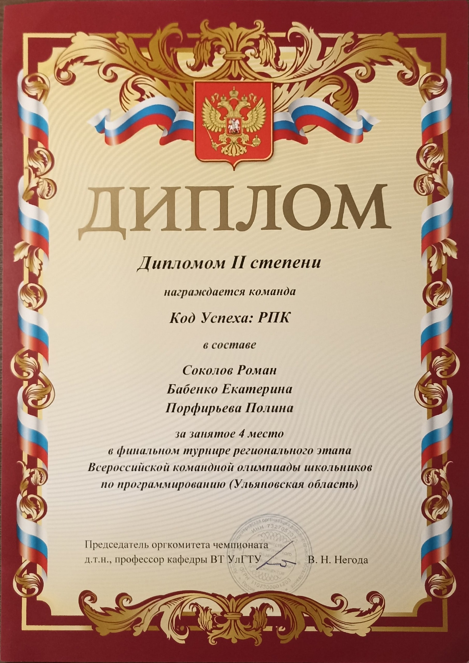 - Бабенко Екатерина, Всероссийский уровень, Командная олимпиада, Порфирьева Полина, Призёр, Программирование, Соколов Роман